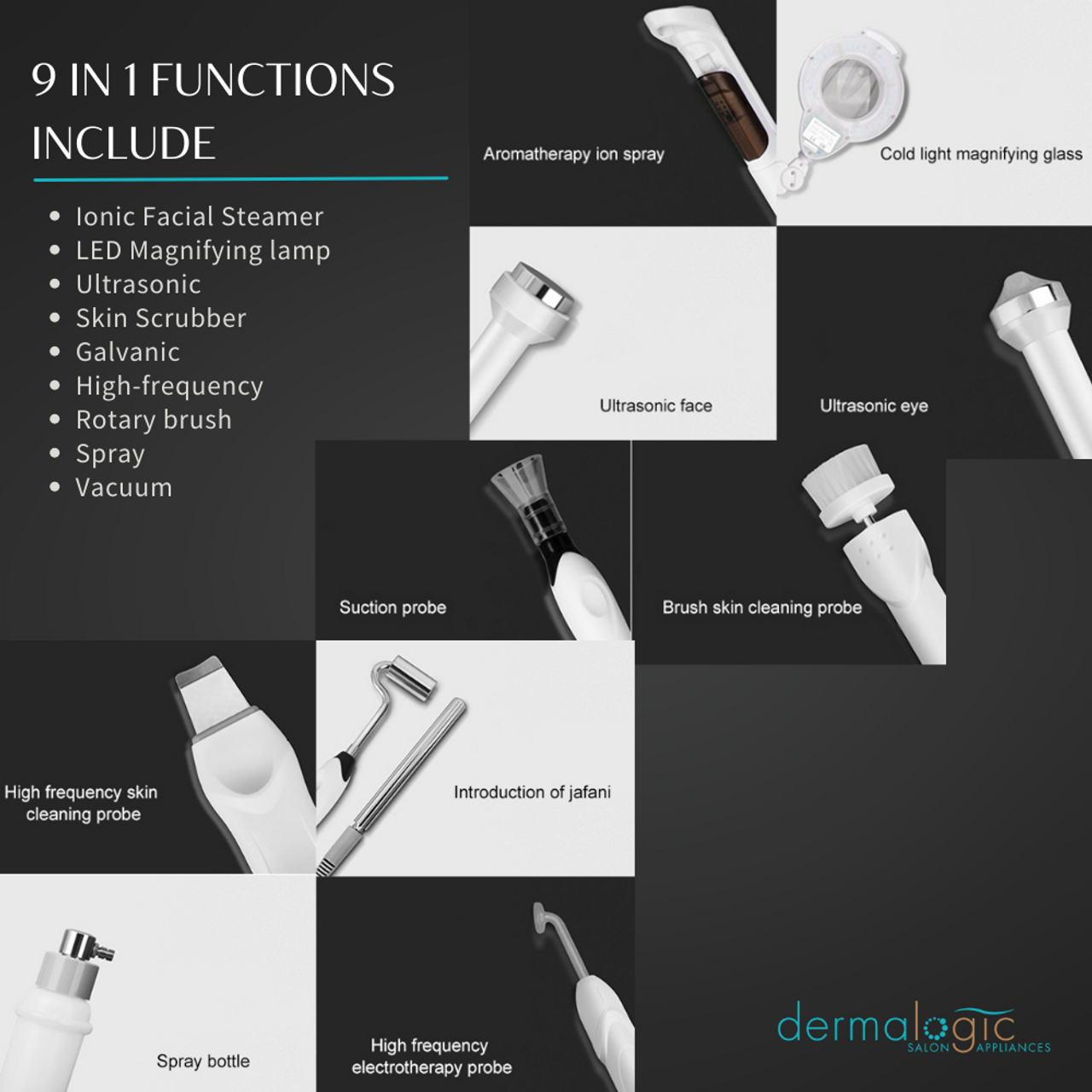The functions include: Ionic Facial Steamer, LED Magnifying Lamp, Ultrasonic, Skin Scrubber, Galvanic, High-Frequency, Rotary Brush, Spray and Vacuum.
